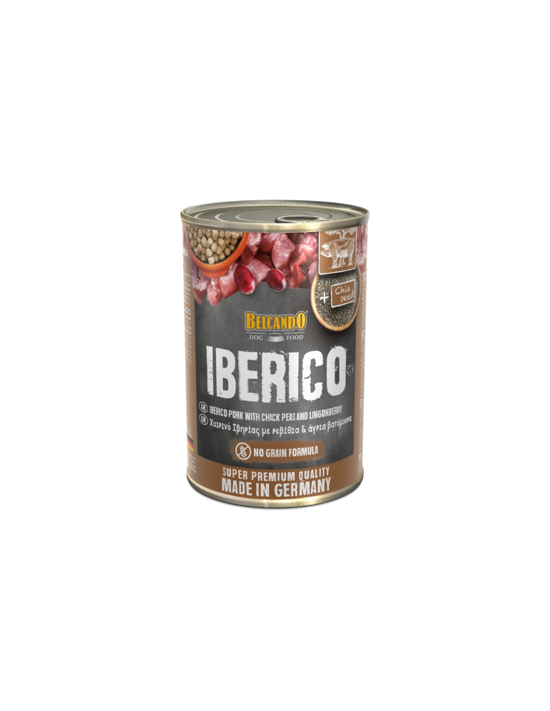 Alimento húmedo completo y sin cereales para perros adultos, formulado con un 65% de carne auténtica de cerdo ibérico (monoproteico), enriquecido con garbanzos y arándanos.