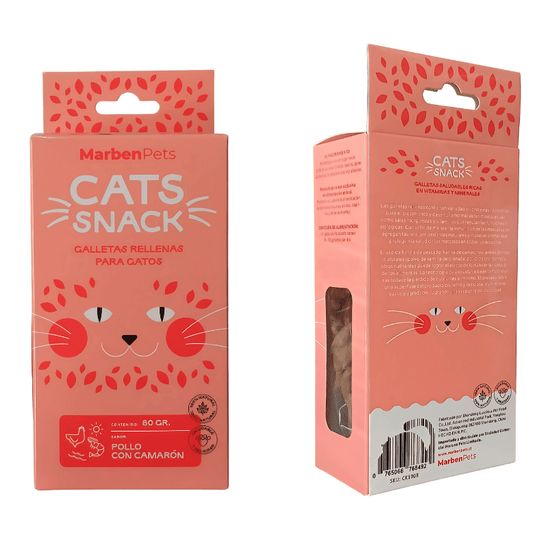 Cats Snack Galletas Rellenas de Pollo con Camarón son un snack premium diseñado para consentir a tu gato con una combinación de sabor y nutrición. Su exterior crujiente y su relleno suave entregan una experiencia de textura que encanta. Elaboradas con ingredientes de calidad como harina de camarón, harina de pollo, harina de pescado y mezclas nutritivas, aportan proteínas esenciales, vitaminas y minerales que favorecen el crecimiento y la salud general de tu mascota. Contienen antioxidantes naturales y taurina, que apoyan las funciones visuales y cardíacas. Este producto sirve como premio (no alimento completo), y se recomienda ofrecer entre 8 y 10 galletas al día, acompañadas siempre de agua fresca. Mantener en un lugar seco y proteger del sol.