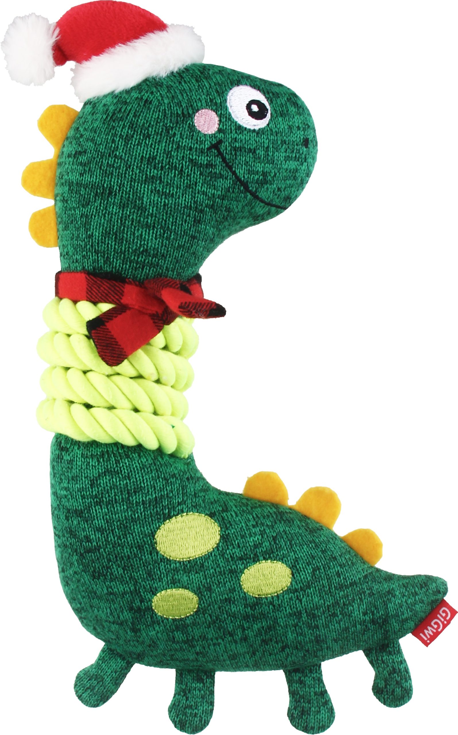 Juguete festivo para perros de la línea GiGwi X-Mas Tales con diseño de dinosaurio navideño, cuello de cuerda para interactuar y elemento sonoro interno que estimula el juego activo.