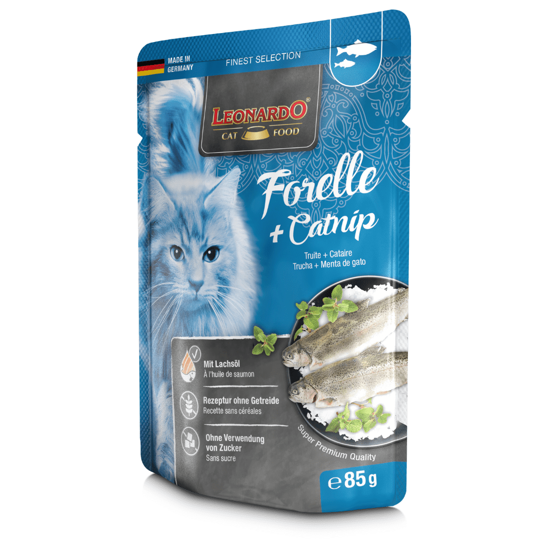 Leonardo alimento gato trucha y catnip sobre pouch 90g